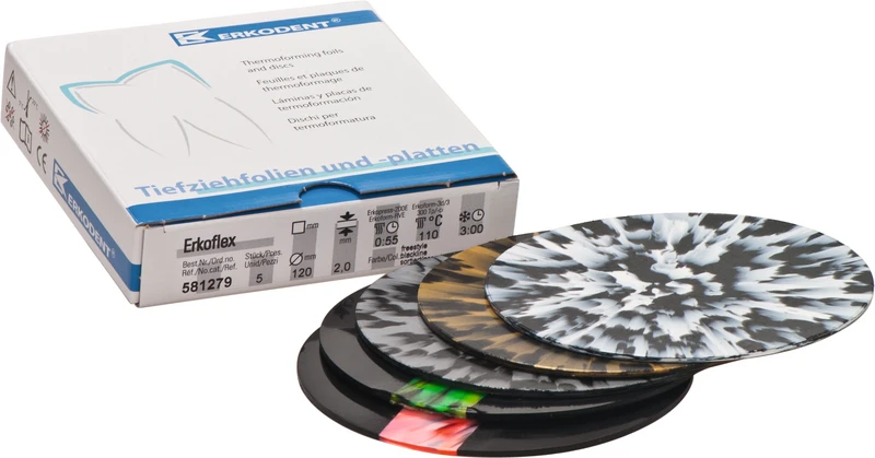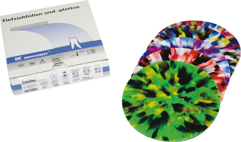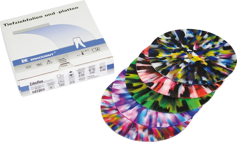 | Variant | <b>Pakke</b> 5 vakuumformingsfolier tie-dye, Ø 120 mm, tykkelse 2 mm |