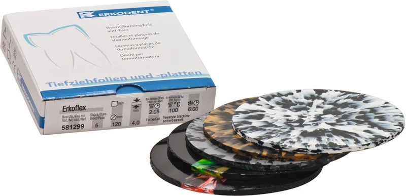 | Variant | <b>Pakning</b> 5 vakuumformingsfolier blackline assortert, Ø 120 mm, tykkelse 4 mm |