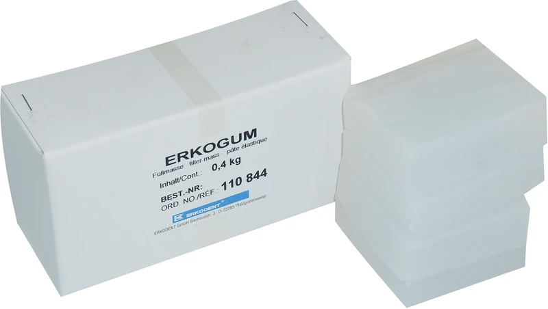 Til beskyttelse av gjenværende tannsett og for avblokkering under sammenfallende modellpartier. Ved lengre lagring oppstår en stivning av ERKOGUM. Ved å kna kan den opprinnelige elastisitetsgraden gjenopprettes. Helt uttørkede gipsmodeller fuktes lett.