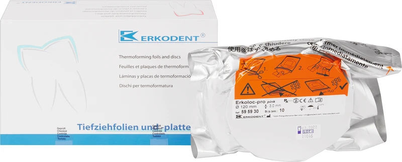 Erkoloc-pro pink er en to-lags folie med farget mykt lag. Det myke laget gir høyeste bærekomfort. Den rosa-transparente fargen reduserer misfarging og gjør det lettere å skille mellom over- og underkjeve ved Silensor-sl.