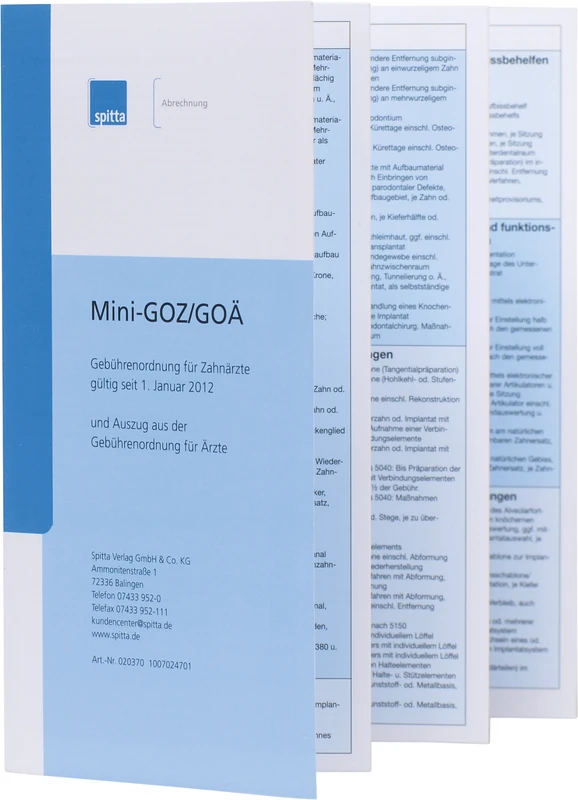 Mini-GOZ/GOÄ gir deg en rask oversikt over alle posisjonene i den nye GOZ 2012. I denne håndlige, foldede brosjyren (foliebelagt og vaskbar!) finner du alle posisjonene i den nye GOZ 2012 og de GOÄ-områdene som er åpnet for tannleger listet opp: med ytelsestekst og poengsum.
