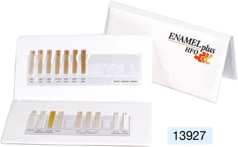 Fargesystem etter Prof. Lorenzo Vanini. Dette fargekortet gjør det mulig å enkelt og systematisk bestemme farge i henhold til de fem fargedimensjonene definert av Vanini – Enamel plus HFO-systemet gjør det mulig med sine forskjellige masser (dentin, emalje, opalescent emalje, intens emalje og malefarger) å gjenskape disse fargedimensjonene. Fargekortene forenkler valg og registrering av riktig farge.