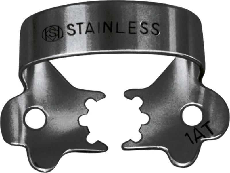 Mattsvarte kofferdamklemmer.