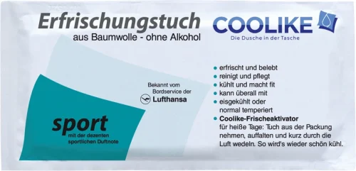 Coolike-friskhetsaktivator for varme dager. Ta ut kluten fra pakken, brett den ut og vift den kort gjennom luften. Da blir den deilig kjølig igjen. Original Erfrischungstücher laget av myk bomull, uten alkohol.