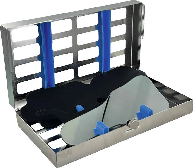 Disse kassettene lar deg oppbevare og sterilisere tilbehøret til intraoral fotografering. Enkel tømming ved rengjøring i ultralydbad eller termodesinfektor. Speilene holdes på plass og oppbevares trygt. Kassetten er utstyrt med silikoninnlegg formet for å holde speil og speilhåndtak sikkert. Det nye låsesystemet er svært pålitelig og enkelt i bruk. Sterilisering i autoklav (se bruksanvisningen som følger med kassett).