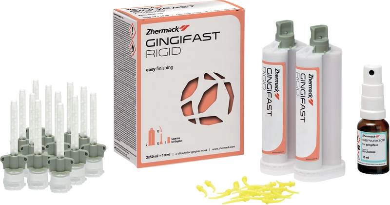 Gingifast Rigid er et A-silikon for gingivamasker. Den har høy endehardhet på 70 Shore A og utmerket estetikk. Videre er den kompatibel med ulike teknikker (direkte eller indirekte). Gingifast-gingivamasker er lette å bearbeide og kan appliseres direkte. For ethvert behov den riktige gingivamasken. Farlig gods – ingen henting mulig.
