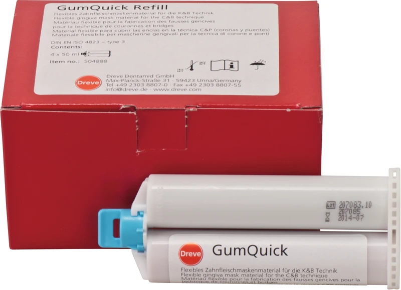 Addisjonshærdende silikon for fremstilling av fleksible gingivamasker. Flyteegenskapene til GumQuick gjør det mulig å arbeide punktvis med utmerket detaljnøyaktighet. Isolermiddelet DuoSep som følger med settet, tillater også direkte maskefremstilling i avtrykket.