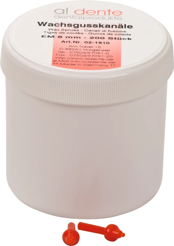 Strømningsgunstigste form for støpekanalen. Resultatet er et mer homogent støpestruktur uten lunker. al dente Guss-Sticks „EM“ med hodediameter 6–7–8 mm for edelmetalllegeringer. al dente Guss-Sticks „NEM“ med hodediameter 7–8–9 mm og forstørret kanalarea spesielt for vakuumtrykksstøping samt edelmetallreduserte og NEM legeringer.