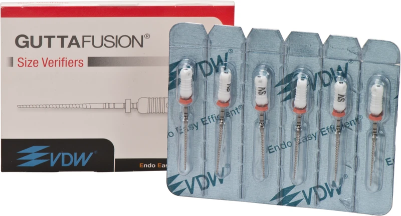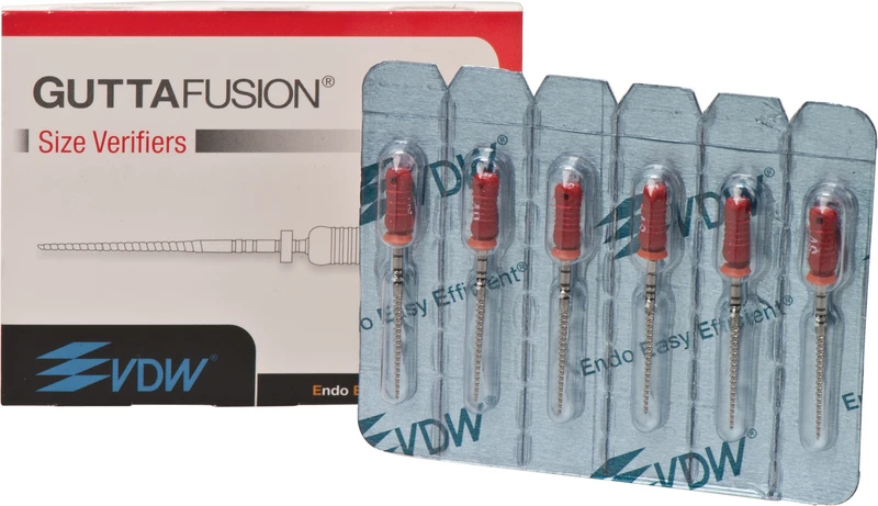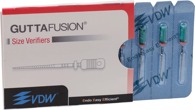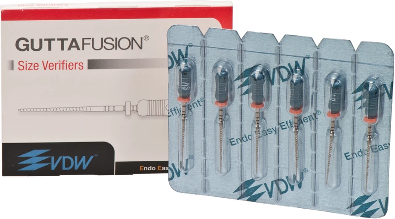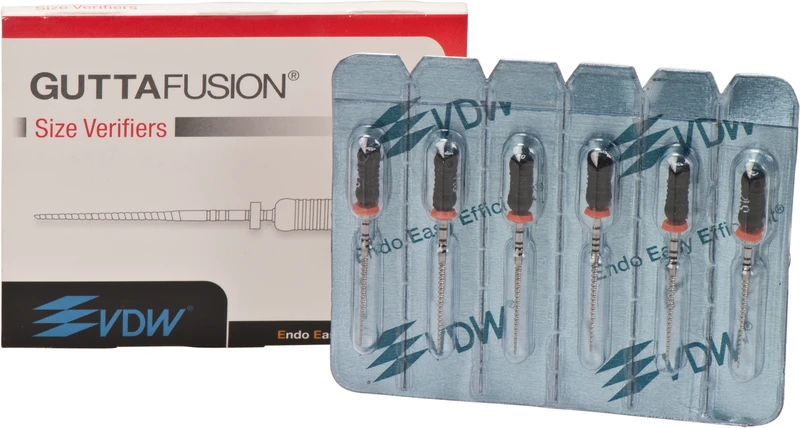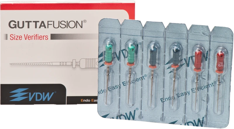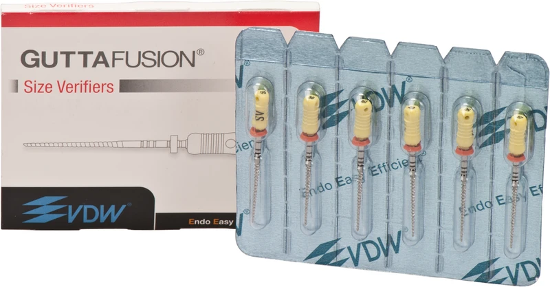 GUTTAFUSION® Size Verifier av nikkel-titan er en del av GUTTAFUSION®-systemet og gjør det mulig å velge riktig GUTTAFUSION® obturator. De er bl.a. ISO-fargekodet og røntgenopake.