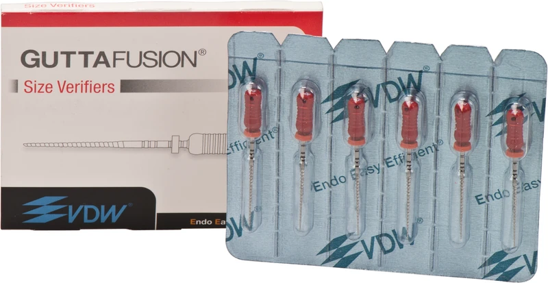 GUTTAFUSION® Size Verifier laget av nikkel-titan er en del av GUTTAFUSION®-systemet og muliggjør korrekt valg av passende GUTTAFUSION®-obturatorer. De er blant annet ISO fargekodet og røntgenopake.