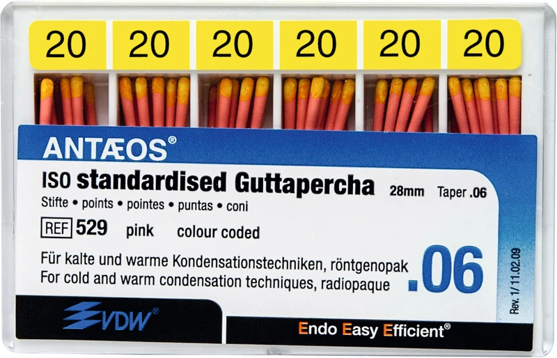 • Guttaperka Taper.02 ISO standardisert. Guttaperka Taper.04 og .06 for rask obturasjon “Crown Down” av preparerte kanaler