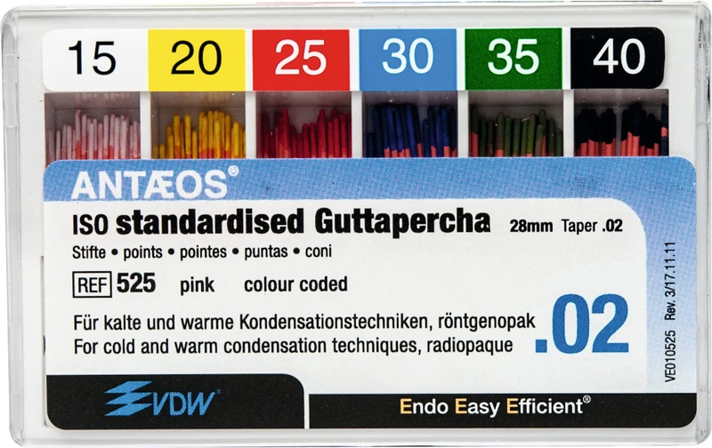 - Guttaperka Taper.02 ISO standardisert. Guttaperka Taper.04 og .06 for rask obturasjon “”Crown Down”” av preparerte kanaler