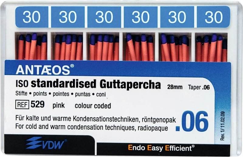 • Guttapercha Taper.02 ISO standardisert. Guttapercha Taper.04 og .06 for rask obturasjon “Crown Down” av preparerte kanaler
