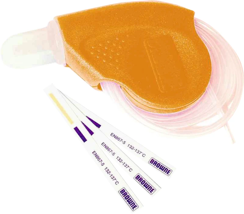 Testsystem i henhold til EN 867-5 for batchkontroll og for testing av funksjonen til det fraksjonerte forvakuumet i en klasse B autoklav. Etter 250 tester er Helix forbrukt.