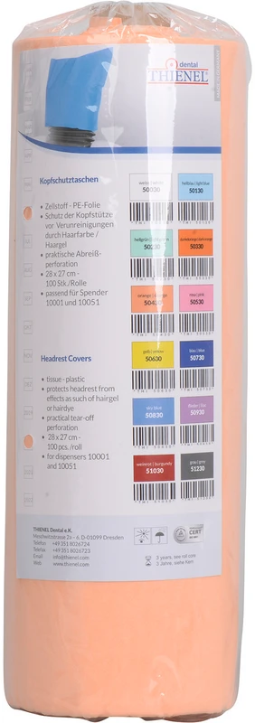 Cellulose – PE-folie. Beskyttelse av hodestøtten mot forurensninger. Fargematchende med våre pasientforklær. Praktisk avrivningsperforering.