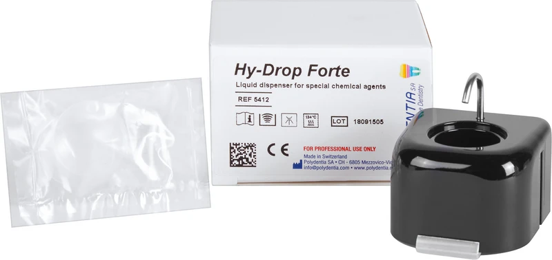 Hy-Drop Forte er en praktisk hygienisk væskedispenser som er kompatibel med aggressive kjemiske substanser, som for eksempel: ChKM-Lösung®, Fokaldry®, Orthoskavident® C, Tubulicid Red® + Blue® Label, Tubulicid Plus Endo®, Cavidex®.