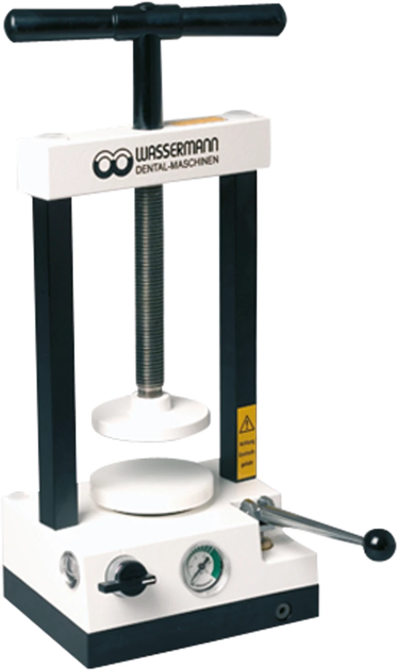 Bruddfast hydraulikkpresse av trukket stål for materialtilpasset pressing av kuvetter. Arbeidstrykk opptil 6 tonn, trinnløs regulering. Meget høy stabilitet. Oksidasjonsfri stempel med automatisk tilbakeløp.