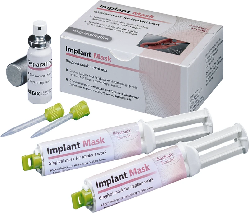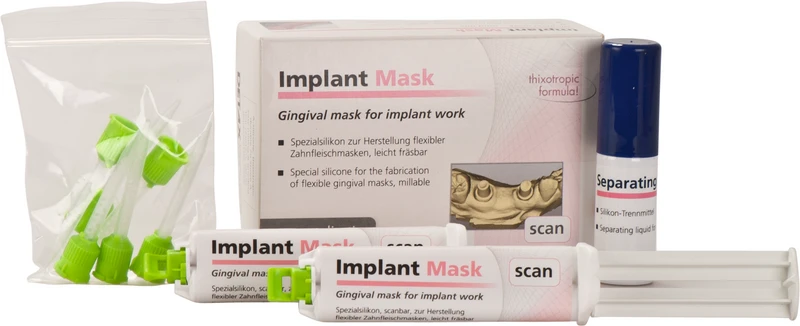 Spesialsilikon, addisjonshærdende, for fremstilling av fleksible gingivamasker ved høypresise implantatarbeider, lettflytende, rivefast, dimensionsstabil. Jevn omslutning av avtrykksstifter takket være høy flyteevne. I praktiske mini-mix håndbeholdere for direkteapplikasjon, uten miksesprøyte. Problemfritt å reponere ved optimal elastisitet. Meget fresbar takket være høy endehardhet, ca. 70 Shore A. Farge gingiva. Scan-versjon, for pudderfri digital 3D-avlesning. Lesbar av alle vanlige digitalskannere, høy opptakskvalitet for forstyrrelsesfri bildegjengivelse og datahåndtering.
