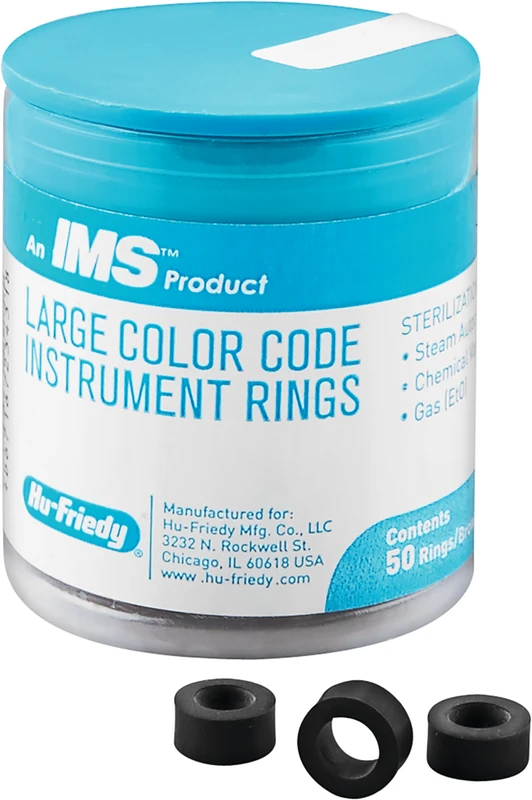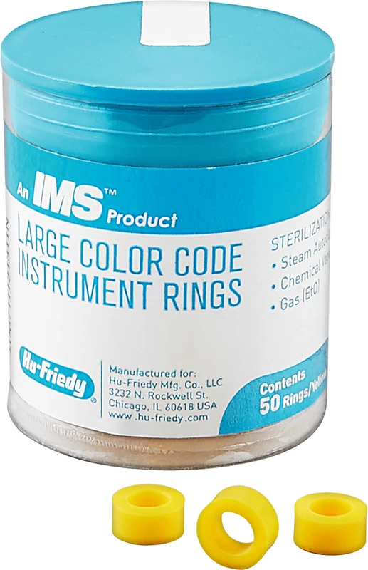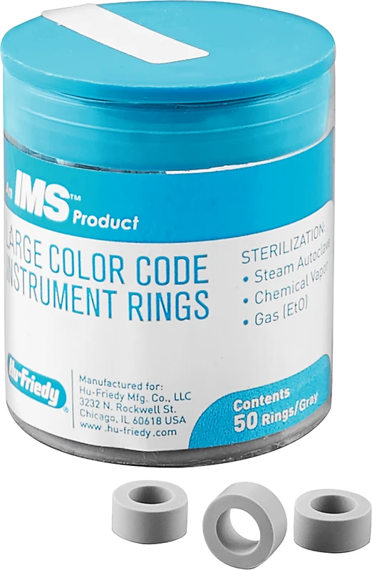 Fargekodingsringer av silikon for identifisering og ordning av instrumenter. Ringene er spesielt egnet for å oppbevare instrumentene i kassene i nødvendig rekkefølge og for å raskt kunne identifisere dem for ønsket prosedyre.