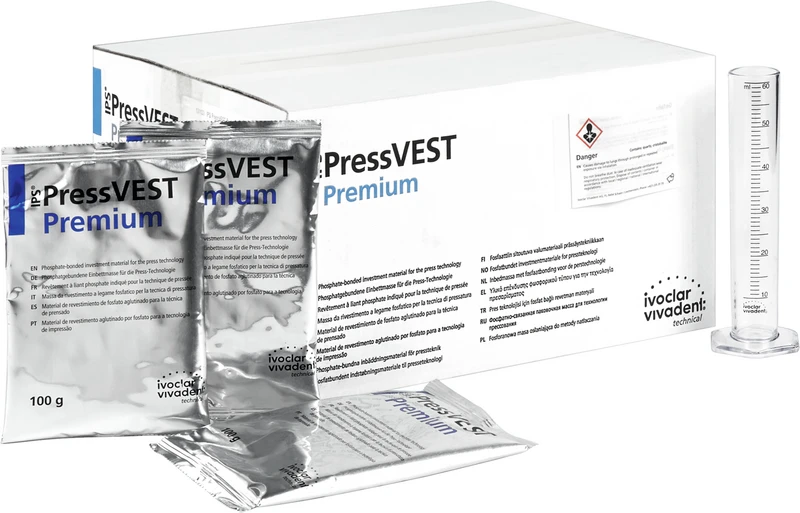 IPS® PressVEST Premium er den universelle, fosfatbundne innstøpningsmassen for Ivoclar Vivadent-presskeramikk. Den kan brukes både i det populære Speed- og i det konvensjonelle oppvarmingsforløpet. Spesielt kjennetegnes den av det minimale, lett avtakbare reaksjonssjiktet, de glatte overflatene og den svært høye passnøyaktigheten.