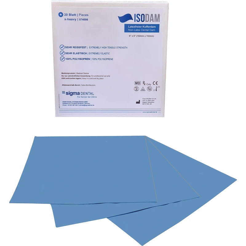 Med utviklingen av isodam har man klart å kombinere de positive produktegenskapene til en god lateks-kofferdam med et lateksfritt produkt. Dermed er håndteringen like enkel som med en god lateks-kofferdam. Farge: lyseblå.