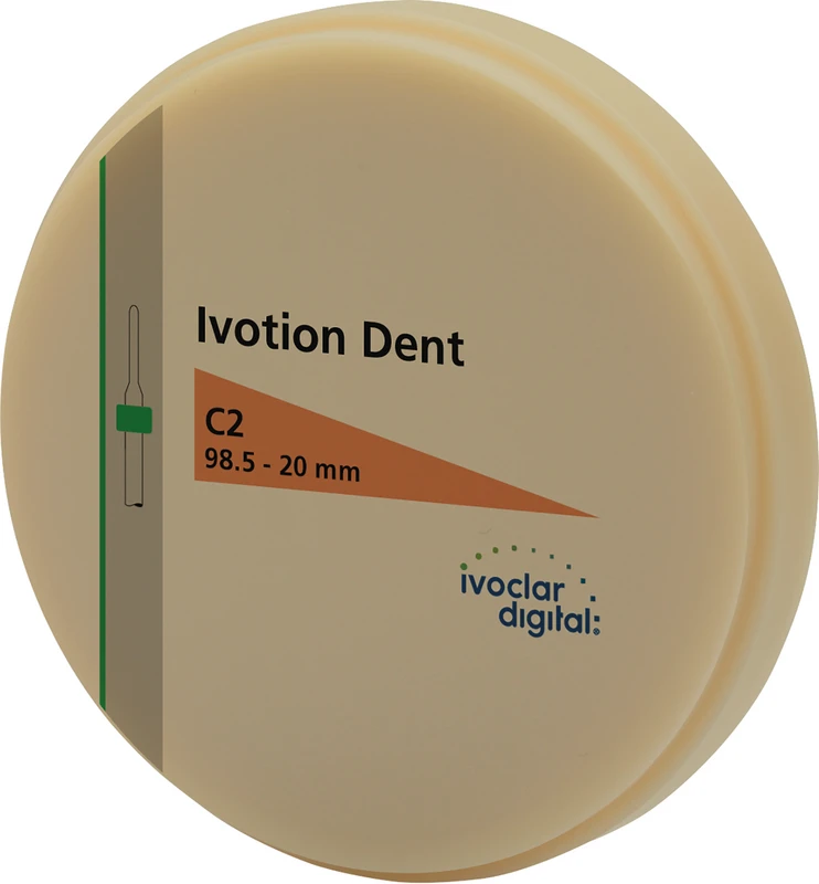Ivotion Dent er tannfargede, monokromatisk fargede skiver av DCL-materiale. Materialet kjennetegnes av optimal translucens og dessuten av sin naturlige fluorescens. Den høye estetikken oppnås gjennom tre vesentlige faktorer: Lav opasitet i kombinasjon med den anatomiske formen på fronttennene og et naturlig overflatedesign.- Tykkelse: 20 mm