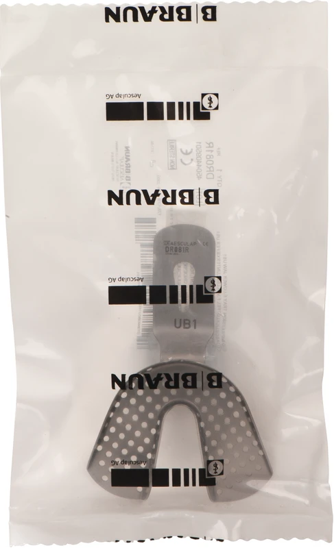 Avtrykksskje i perforert utførelse. Ved bruk av plastiske eller elastiske avtrykkmaterialer gir gjennomtrengningen av materialene gjennom skjeen det nødvendige grepet for et godt avtrykk. Avtrykksskjeene er laget av rustfritt 18/8 stål.