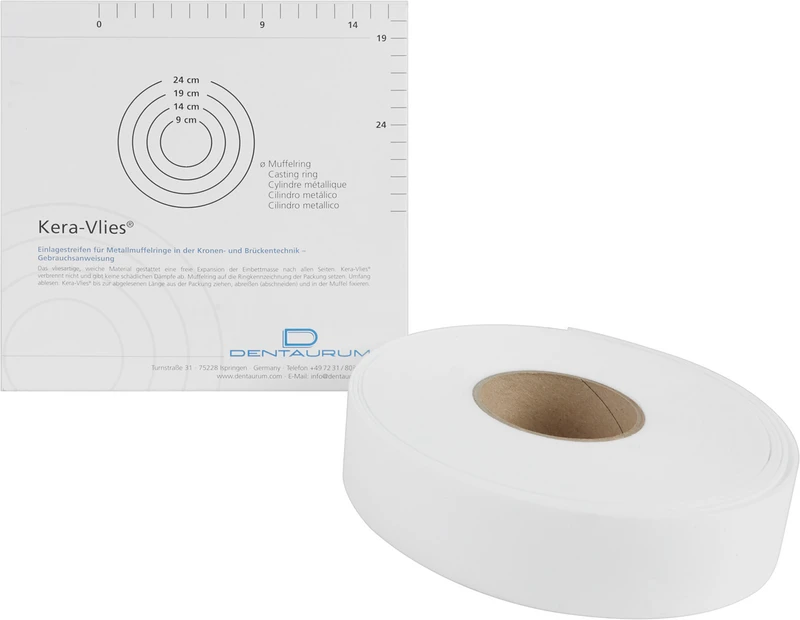 Asbestfrie innleggsstrimler for metallmuffelringer i krone- og broteknikk. Kera-Vlies® produseres i forbedret helsemessig kvalitet. Selv de strengeste krav i arbeidsmedisinske retningslinjer oppfylles. Fri ekspansjon gjennom filtaktig materiale. Kera-Vlies® brenner ikke og utvikler ingen helseskadelige damper. Lett å fjerne etter støping.
