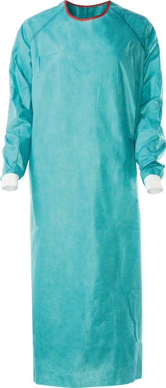 Halvarmforsterket OP-innpakningskåpe med væsketett, pustende halvarmforsterket raglanarm samt væsketett, pustende brystforsterkningsområde og spesielt bred overlapping av ryggpartiet; med det patentbeskyttede Combitape®-lukkesystemet som fester seg sikkert på hver del av kåpens bakside og sikrer fleksibel tilpasning av halsåpningen; med rød halsåpning (forsterket) for bedre identifikasjon i OP; for operasjoner med høy væskeproduksjon; med SMS-innpakning og papirhåndklær; individuelt pakket.