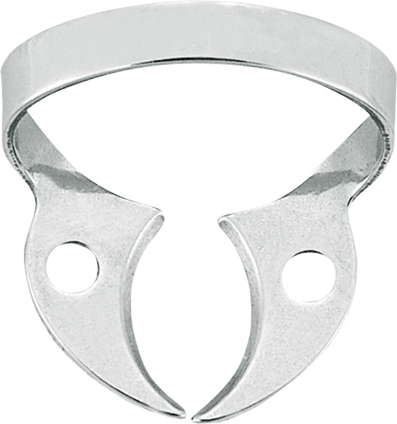Høykvalitets rustfrie stålklemmer med pålitelig konstant spenning for å feste kofferdam til den behandlede tannen.