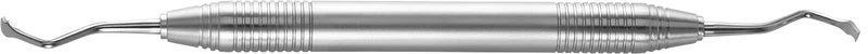 Knochenmeißel zur Konturierung der Kieferknochen, aber auch zur Gewinnung von autologem Knochenmaterial geeignet. Besonders scharfe Kanten erlauben den Einsatz auch an sehr schwer zugänglichen Stellen. Die spezielle Biegung der Arbeitsenden sorgt für maximale Effizienz und ermöglicht gleichzeitig eine sehr gute Sichtkontrolle der Menge des gewonnenen Knochens. Die beiden Außenkanten sind abgerundet, um das Trauma zu minimieren, so werden tiefe Einkerbungen vermieden. Ergonomischer Griff für maximale Kontrolle und Kraftübertragung. Die matte Griffoberfläche reduziert störende Lichtreflexionen.