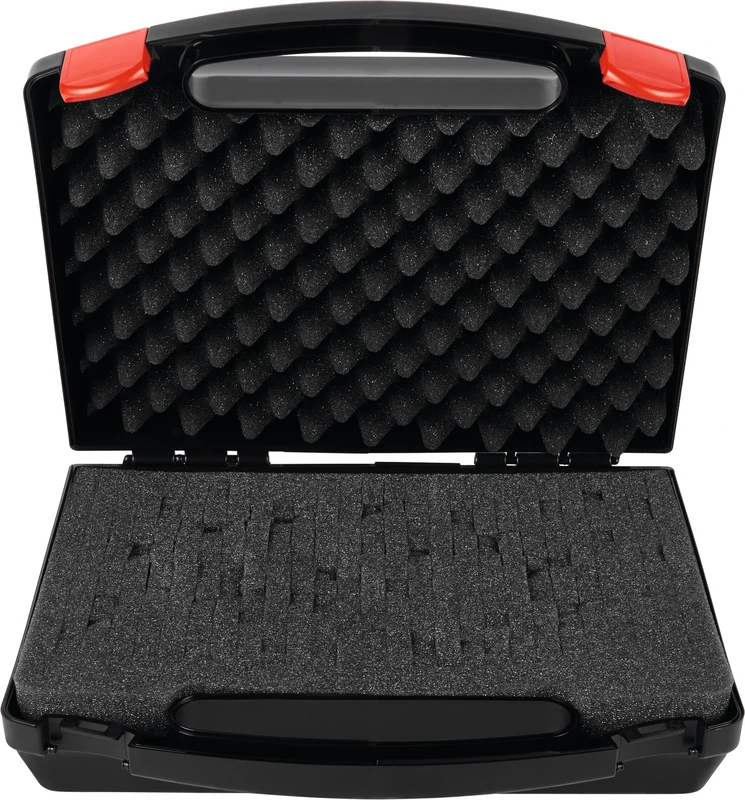 Koffert laget av svart plast med skuminnlegg, tom, for 3 fotospiegel med håndtak Utvendige mål: 285 x 240 x 100 mm.