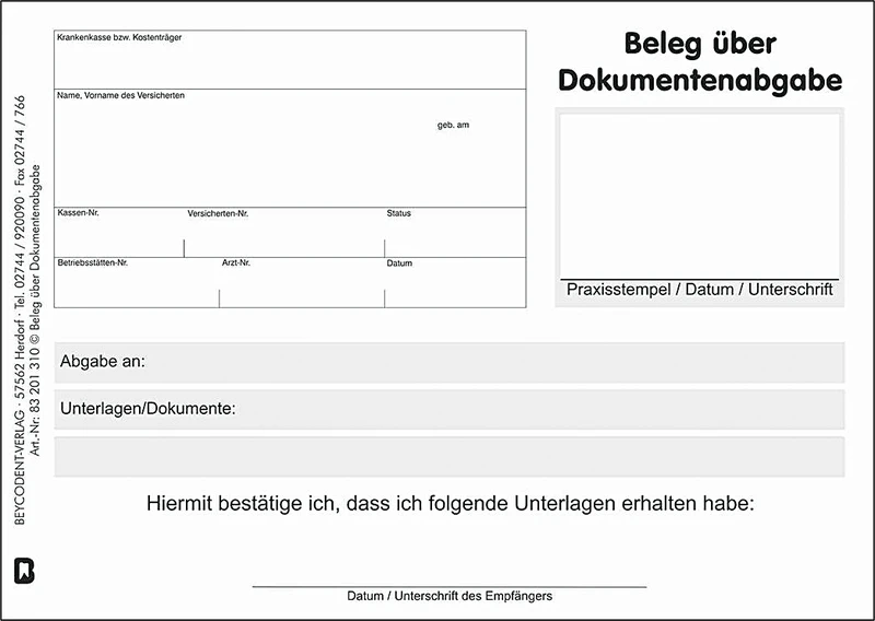 Kvittering for utlevering av røntgenfilmer og dokumenter.