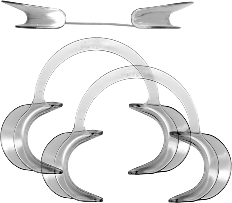 Steriliserbar. Av autoklaverbart polykarbonat. Forbundet med elastisk tverrstag. Enkel å bruke. Gir fri sikt og et fritt arbeidsfelt. Ideell for problematiske pasienter og barn. Ikke-reflekterende, ideell for Polaroid- og intraorale opptak. Til sterilisering anbefaler vi skåneprogram 121° C – må ikke komme i kontakt med metallinstrumenter!