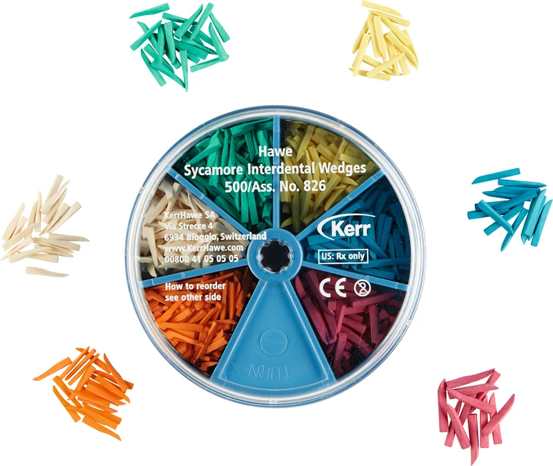 Ahorn-Interdentalkeile er anatomisk optimalt formet. De konkave sidene tilpasser seg ideelt den interdental morfologien. Den rektangulære enden muliggjør et sikkert grep om kile, den oppbøyde spissen forhindrer skade på papiller. Interdentalkile er laget av splittfritt ahorntre, som sikrer stabilitet og komprimerbarhet og dermed en optimal tilpasning til tannen. Fargekodet.