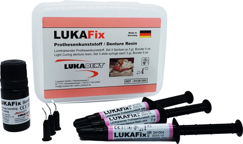 LUKAFix er en lysherdende, geleaktig proteseplast for bruk i praksis og laboratorium. Den muliggjør raskt arbeid uten forkanter eller lange polymeriseringstider og kjennetegnes av ukomplisert bearbeiding, høy formstabilitet og fremragende modelleringsegenskaper. LUKAFix er fri for MMA og dermed spesielt kroppskompatibel. Den kan herdes problemfritt i vanlige lyssystemer uten vakuum.