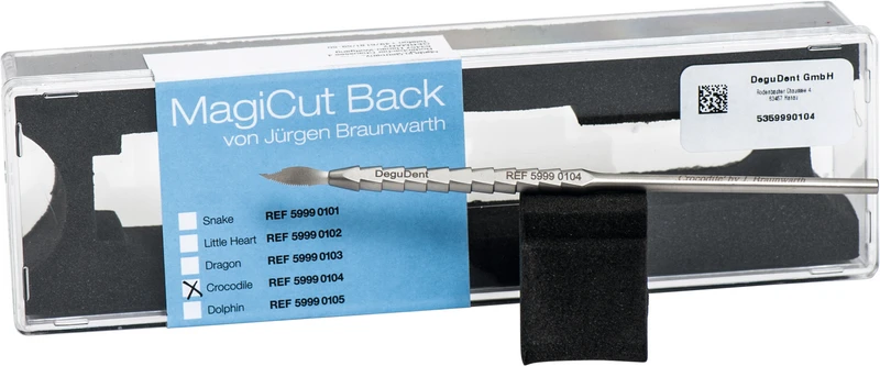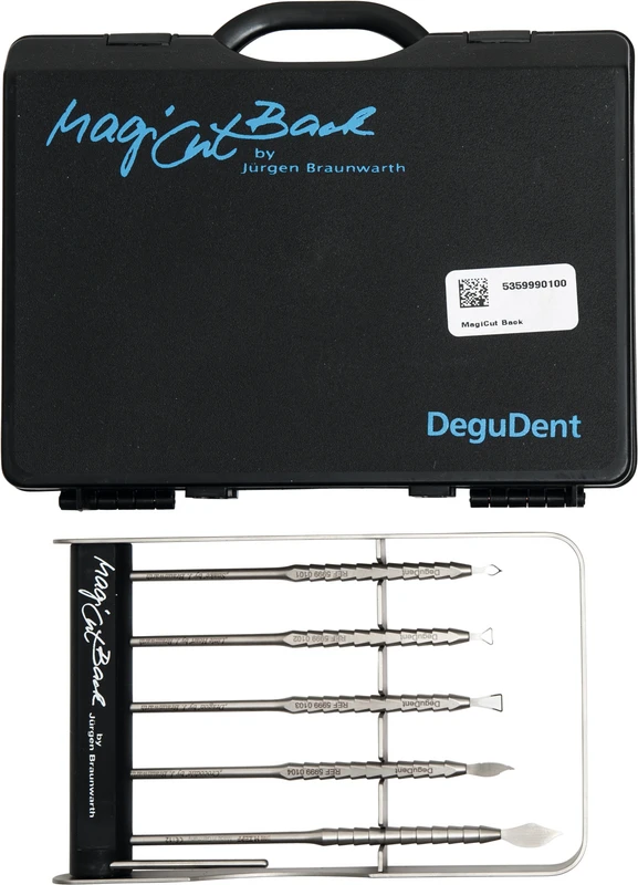 Med presisjonsverktøylinjen MagiCut Back etter J. Braunwarth har du alltid det ideelle verktøyet for en fin bearbeiding av modelleringsmassene før sintring. De karakteristiske formene til de 5 instrumentene, som også gir navnene deres, gjør det lettere å manuelt finarbeide tannlag og -former under keramikkoppbyggingen ved skraping, riss, avtaking, separering og deling.