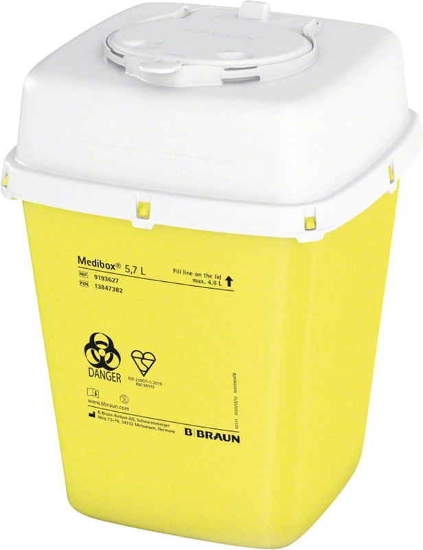 Avfallsbeholder for avhending av spisse og skarpe gjenstander i medisinsk miljø.