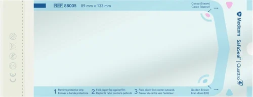 Flate, selvklebende poser for damp- og gasssterilisering med innvendige og utvendige indikatorer. Utstyrt med bredt klebebånd for sikker lukking og pålitelig forsegling. Den rivesterke, transparente flerlagede folien av polypropylen/polyetylen er blåfarget og letter både synet på instrumentene og oppdagelsen av stikk eller rifter i folien.