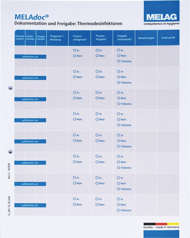 MELAdoc-dokumentasjonsarkene letter dokumentasjonen av rengjøring og desinfisering og godkjenning av RDG-partiet.