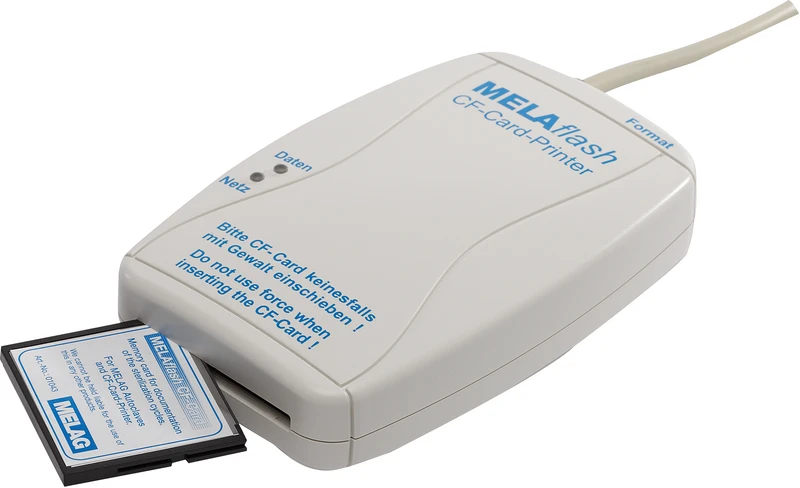 Den MELAflash CF-kortskriveren gjør papirløs dokumentasjon av steriliseringsprosesser mulig. Ved tilkobling av skriveren til autoklaver i Profi-klassen og MELAquick 12+ kan opptil 10.000 steriliseringssykluser automatisk skrives til CF-kortet.