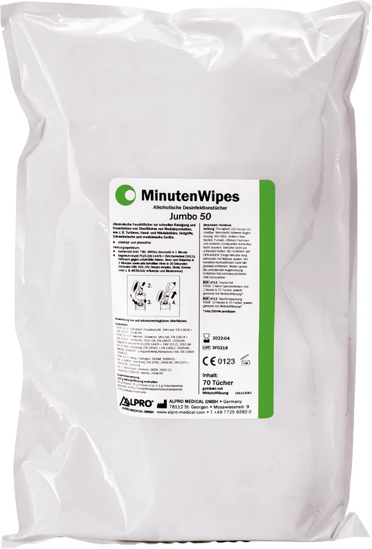 Alkoholbaserte våtservietter for rask rengjøring og desinfeksjon av overflater og medisinske produkter, som for eksempel turbiner, hånd- og vinkelstykker, unitgrep, svevebord og medisinsk utstyr. Aldehyd- og fenolfri. Virker baktericidalt, tuberkulocidalt, mot MRSA, levurocidalt, begrenset virucid PLUS virucid mot ikke-innkapslede Adeno- og Norovirus samt alle innkapslede virus. Begrenset virucid (RKI/DVV) virucid mot alle innkapslede virus, f.eks. HBV, HCV, HIV og influensa. Virkestoffløsningen er VAH/DGHM-sertifisert.