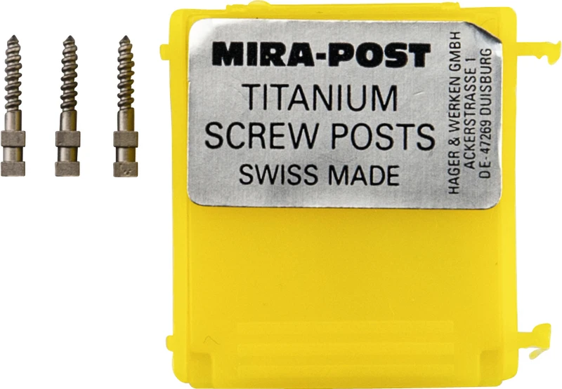 Selvskjærende gjenger.I to versjoner: Titan eller 24 K forgylt. Skruer direkte inn eller sementeres.