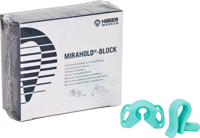 - Sett inkluderer en spesialholder for å feste Mirahold-blokken til kinnet. Ideell for lengre behandlinger
