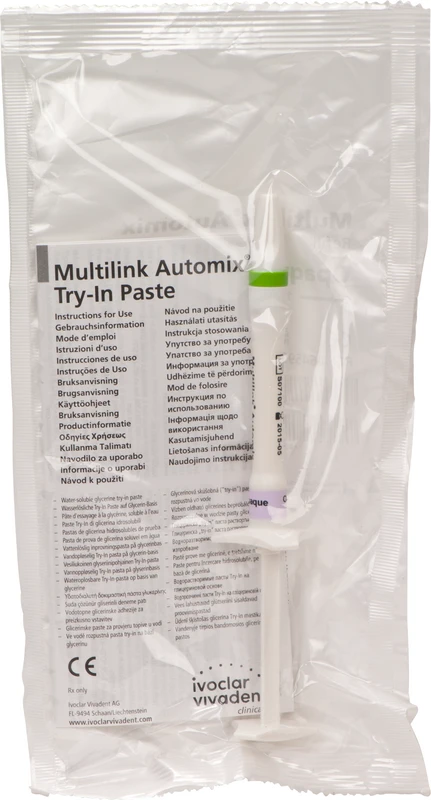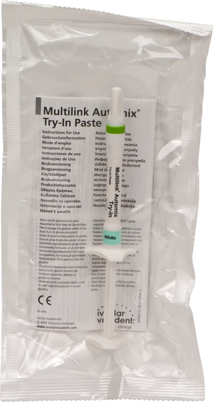 Ny: optimalisert formel, ekstra farge “Hvit”, Try-In pastaer og optimalisert håndtering. For simulering og kontroll av fargeeffekten av restaureringen med den valgte fargen fra Multilink® Automix er det nå tilgjengelige tilsvarende Try-In pastaer på glyserinbasis.