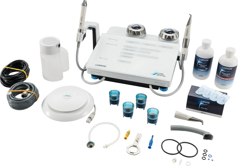 MyLunos Duo® kombinerer to av de viktigste behandlingsmetodene i en profylakseøkt: pulverstråling og ultralyd. Kombinasjonsenheten muliggjør en fullstendig profylakse- og parodontalbehandling med bare én enhet ved høyt fleksibel og behovsbasert anvendelse avhengig av pasienttilfelle – fra supra- og subgingival fjerning av kalk med ultralyd til fjerning av misfarging og biofilm med pulverstrålen.