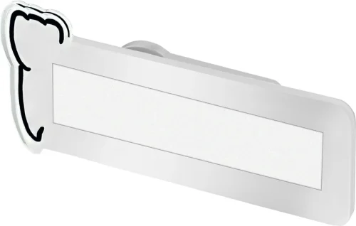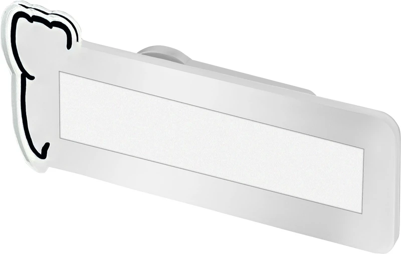 3D-optikken og den konturklipte formen gir en sympatisk, moderne effekt. Det slitesterke plexiglasset beskytter navnestrimmelen, som enkelt kan byttes ut ved behov. Magnetfestet gjør det mulig å bære det sikkert uten hull i klærne.