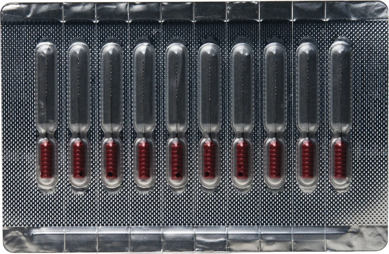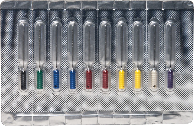 Korte nervekstraktorer i rustfritt stål med fargekodet plastgrep.