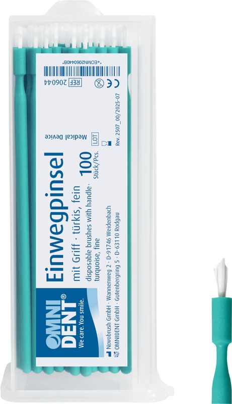 Den Omni engangspensel med grep har en spisset børsteknute. Applikasjonsspissen er bøyelig. Ideell for påføring av etse-geler, linere, fissurforseglere, lakker og bondingmaterialer.