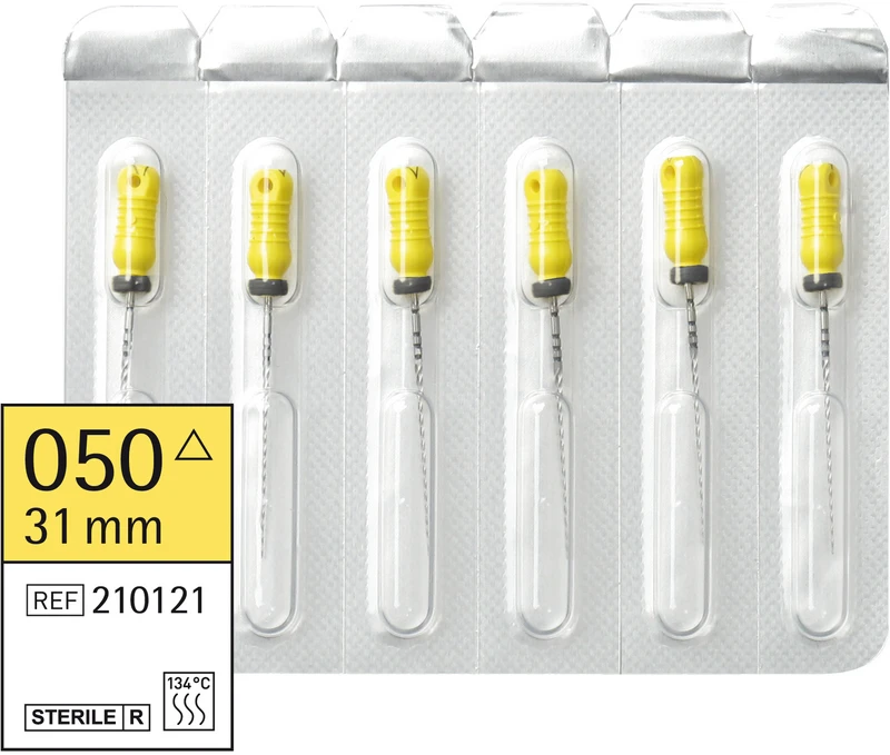 Sterile K-Bohrer fra Omnident er høykvalitets og ISO-konformt nøyaktig produserte endo-instrumenter. De har en meget god skjæreevne og høy bruddstyrke. Instrumentene er fargekodet etter ISO-størrelser og kan steriliseres opp til 134 °C. Håndtaket er rutsjfast takket være det ergonomiske grepflaten, og instrumentet er dermed trygt å bruke. I en blisterpakke, som sikrer hygienisk enkeltuttak, finnes det 6 sterile instrumenter, som er utstyrt med en silikonplugg. Fargekoding plugg: hvit 21mm, gul 25mm, svart 31mm.